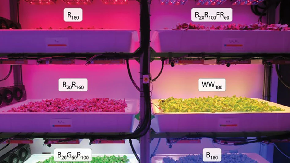 The dynamic delivery of different light spectra during different plant growth phases is not new. For example, in cannabis production, more blue light in the vegetative phase makes plants more compact, while less blue light in the flowering phase can maximize lighting efficiency. Moreover, when greenhouse red-leaf lettuce lacks red color under low light in winter, growers can provide blue-rich supplemental lighting a week before harvest to boost anthocyanin production and thus intensify red color. This is end-of-production lighting, which applies to both greenhouses and indoor vertical farms.