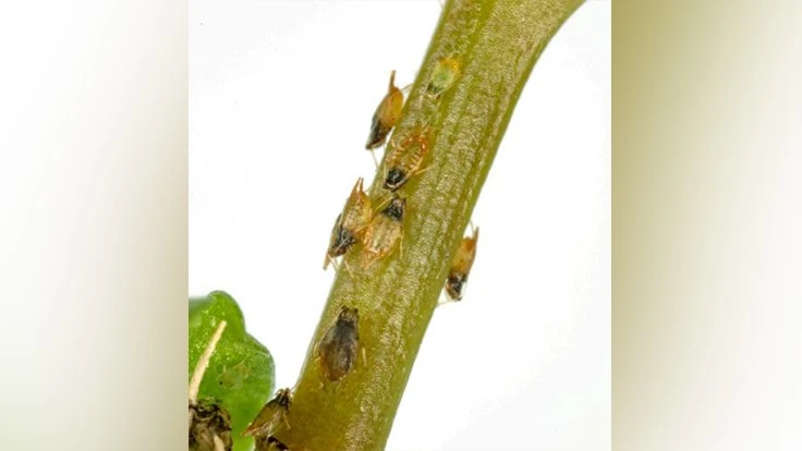 FIELD SCREENING: Myzus fataunae is a minute aphid (0.9-1.0 mm). The adult, wingless forms are two-toned, with a brown head and thorax and yellow abdomen. Young immatures are entirely greenish white, while older instars develop the bicoloration. Most diagnostic characters cannot be seen without high-powered optics. When surveying on the plant, look for small, bi-colored specks.