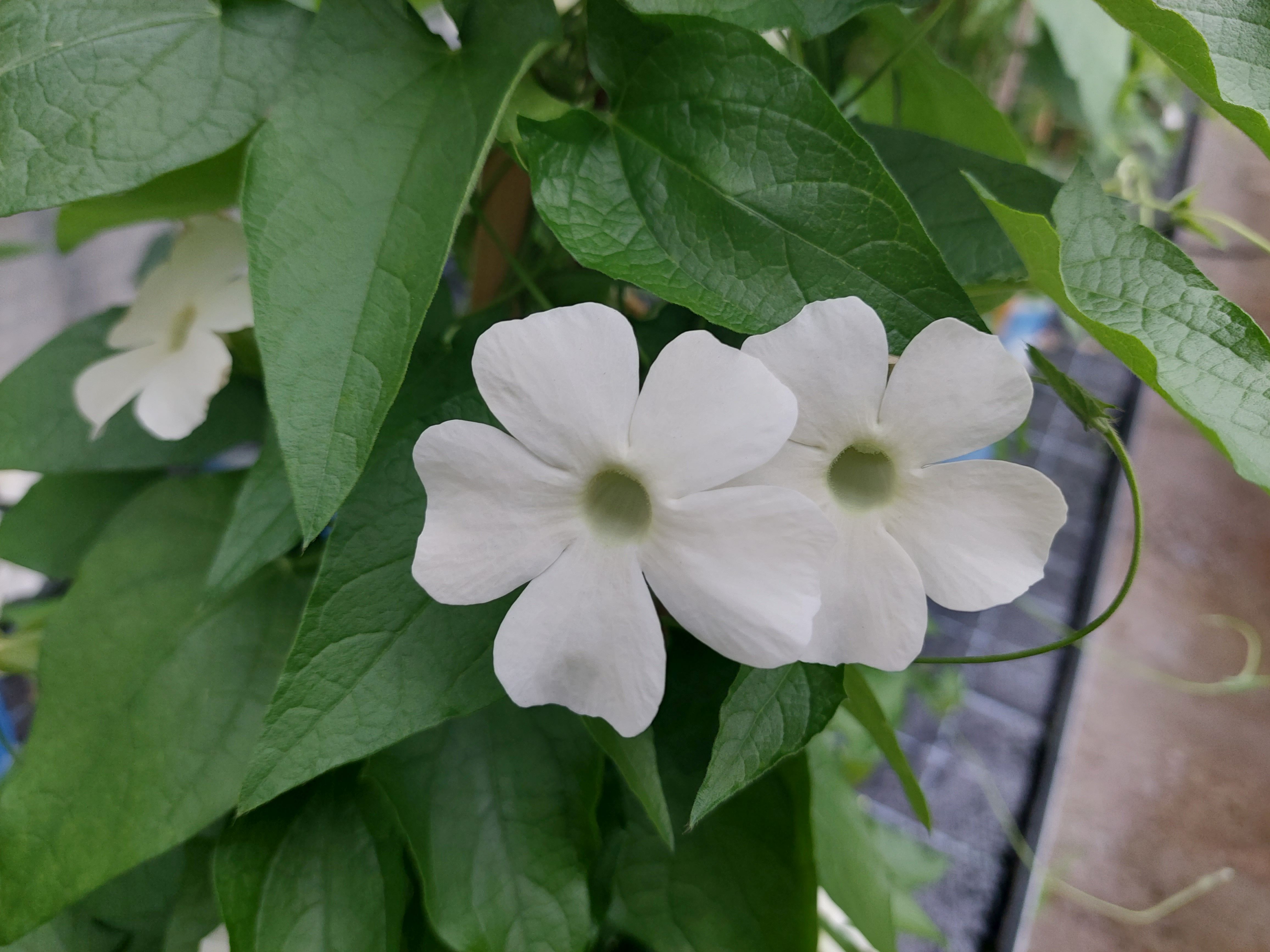 Thunbergia Sunny Susy White Wedding from Jaldety features masses of large white flowers with no dark eye. Early flowering, mainly from spring through autumn. Trailing and climbing habit. Ideal for mixed hanging baskets, pyramids for patios and decks, and as a showy cover for arches, pergolas and window boxes.