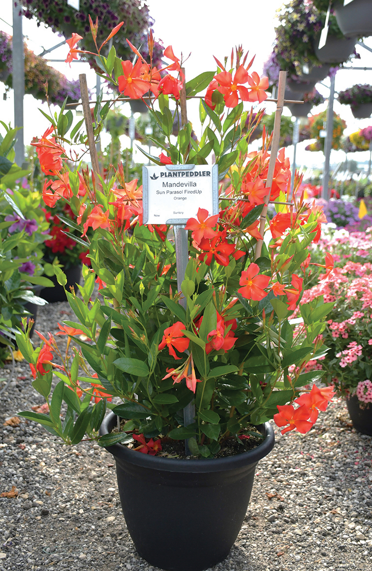 We emphasized the mandevilla and dipladenia crop this year, and the FiredUp Orange was the big winner. A little smaller flowers than the rest of the mandevilla, but made up the color power with the number of blooms it produced. Flowers up and down the entire plant all through the season. Beautiful glossy foliage and bright orange blooms. With the ease of care of the mandevilla class, this plant will be everyone’s favorite. Can be used as a stand-alone pot or in combos. Easy care, with very little to no deadheading.