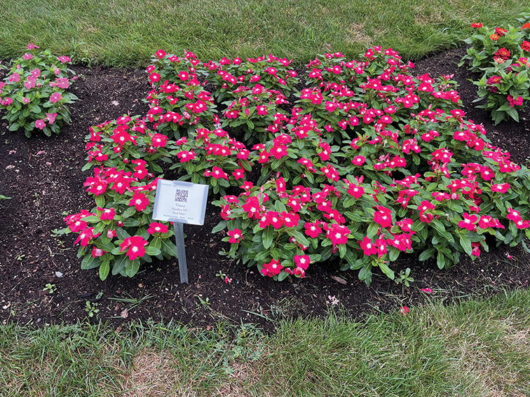 Vinca Cora XDR Red Glow brought neon-bright color and consistent flowering to the trial beds this season. Its glowing red blooms were hard to miss, especially when paired with its clean, glossy green foliage. This variety was the most floriferous vinca in the trial, putting out blooms steadily from early summer through the end of the season. One of the most impressive traits was its uniformity — every plant looked nearly identical in size, shape and bloom coverage. It maintained a tidy, upright habit without stretching or lodging, even in hot, humid conditions.