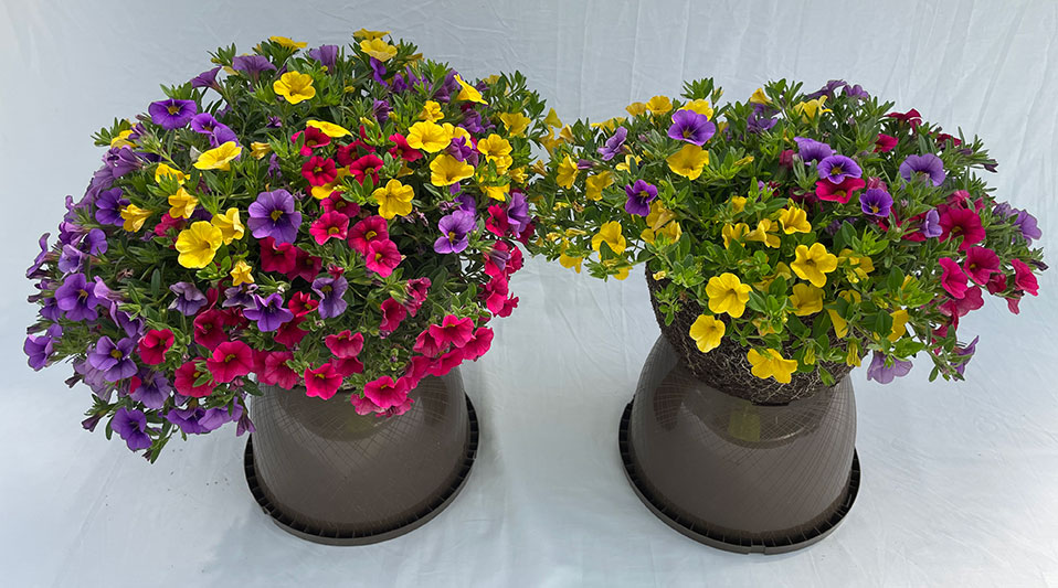 Comparison of calibrachoa hanging basket with Florikan Nutricote (left) and without (right.) Photo courtesy of Profile Products