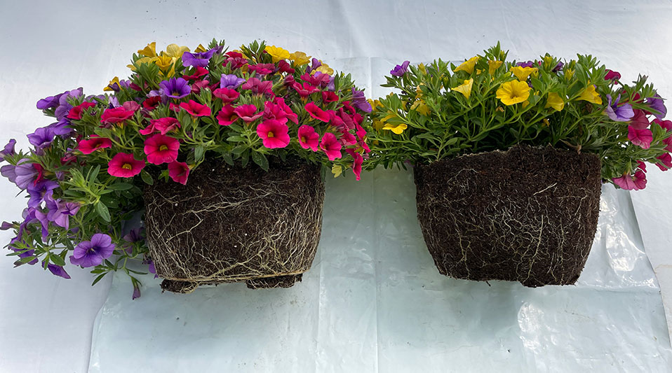Root development in calibrachoa treated with Florikan Nutricote (left) was more advanced when compared to plants only receiving liquid fertilizer. Photo courtesy of Profile Products