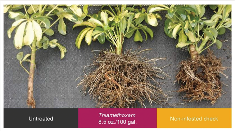 The latest insecticide from Syngenta, Mainspring Xtra, contains the same active ingredient as Mainspring GNL, cyantraniliprole, along with thiamethoxam, for fast knockdown of various pests, including fungus gnats, mealybugs and scale. Mainspring Xtra is also labeled for use on non-bearing fruit trees, nut trees and vegetable transplants for retail sale. Thiamethoxam also promotes plant vigor, enhancing root mass, stem strength and plant greenness to improve overall plant quality compared to untreated plants through the proven Thiamethoxam Vigor Effect.