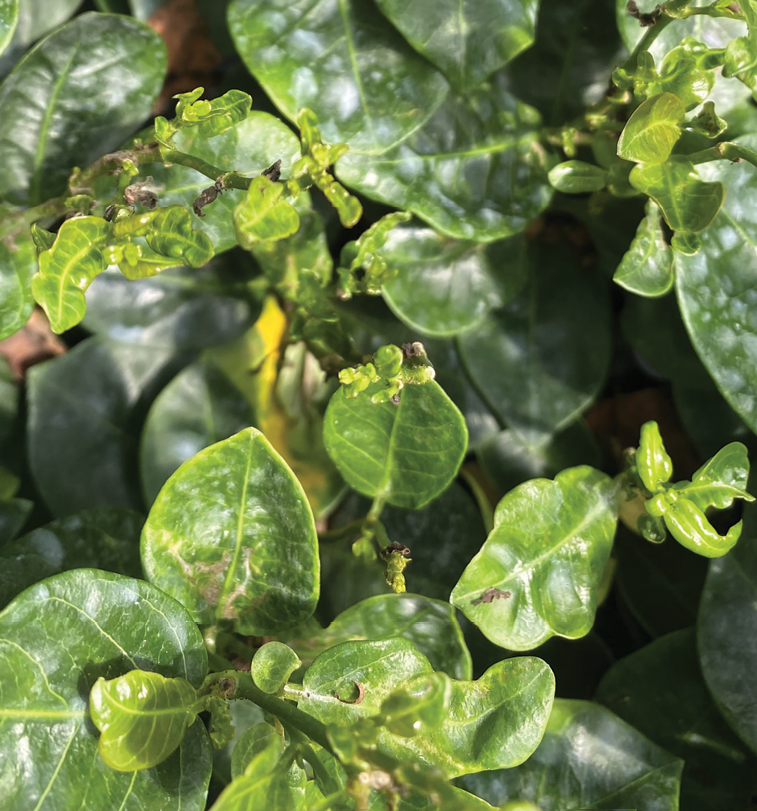 - Excreting honeydew as it feeds, leading to black sooty mold on leaf surfaces.