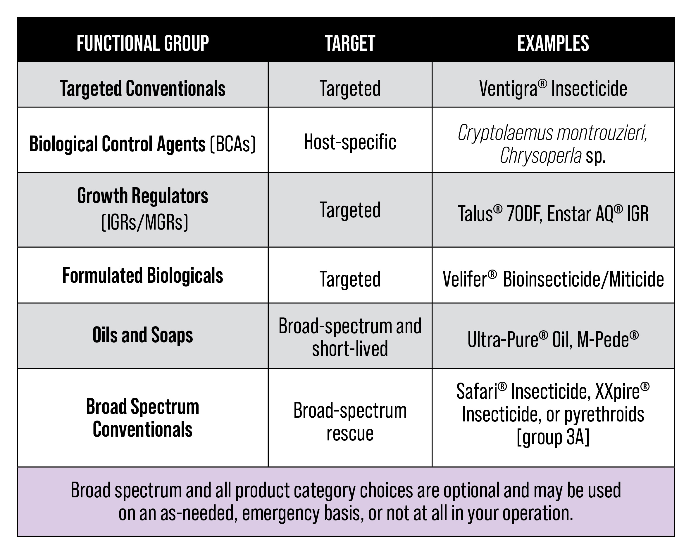 Not every operation will use all five functional groups. For example, some prefer to skip broad-spectrum conventional chemistry or biological control agents (BCAs).