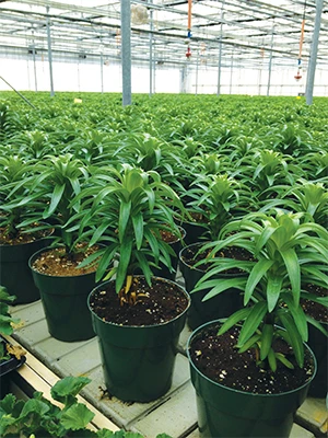 For pot-cooled lilies (including CTF and natural-cooled) start bulb programming by Oct. 26 and hold at 60°F -62°F for three weeks in order to stimulate root development. Then transfer the potted bulbs to the cooler on Nov. 16 (20 weeks before Easter) to start the six weeks of cooling at 40°F -45°F. Start greenhouse forcing by Dec. 28 (14 weeks before Easter). Again, if bulbs arrive late and you don’t have time for the full three weeks of rooting prior to bulb cooling, just give them as much time as the schedule permits prior to Nov. 16 and start the six-week cooling period on schedule.