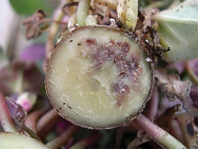 One of the most common pathogens of ornamentals, and many other crops, is Fusarium. Although it is common, it is hard to diagnose without a laboratory to assist. Fusarium can cause a multitude of symptoms. These include leaf spots, cutting rot, crown rot, wilt, bulb rot, and root rot. Fusarium spores move easily with water and can be splashed from one plant to another. They often appear in propagation as cutting rot and are not always the only pathogen involved. Wilt diseases are usually caused by Fusarium oxysporum with a distinct type for each plant species or family affected.