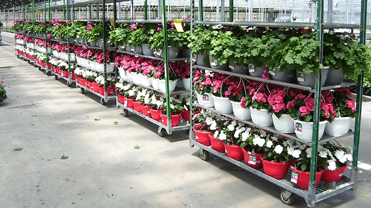 All greenhouse operations can benefit from carts. The savings in labor makes the payback very short. Each time a flat is handled by a worker, at least 3 cents is added to its cost. One to three handlings can be eliminated by loading the plants in the greenhouse, rolling or fork-lifting carts onto a truck and unloading and pushing the carts into the garden center. A typical multi-shelf cart holds 40 to 60 flats.
