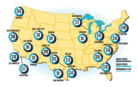 If you look at a map of the country, you’d be hard pressed to find much logic to the price of water. It costs just as much for a family of four using 100 gallons of water per person per day in Boston as it does in Los Angeles (about $82), and less than half as much in Las Vegas ($44) as in Seattle ($99).