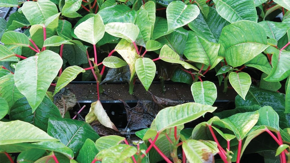 Cuttings are the most vulnerable and unfortunately, they will likely be arriving under worst case scenario conditions. It’s prime summertime and temperatures both inside the greenhouse and on the loading docks are soaring. Heat is your worst enemy and you’re on a time crunch to get them stuck before they dry down or cook — but a little time is what you need to quickly inspect the cuttings as you stick them. Look for brown or black stems, water-soaked lesions or signs of rot. Throw away any suspect cuttings because diseases, especially bacterial soft rots, can quickly spread during propagation (Figure 1). We recommend you apply a preventive fungicide like Pageant® Intrinsic® brand fungicide at sticking and then again two weeks later to protect plants from diseases like Botrytis blight, leaf spots and even Rhizoctonia stem rot. Pageant Intrinsic brand fungicide also provides plant health benefits, including faster callous formation and improved rooting. Get poinsettias ready for the long-haul with a strong root system from the start.