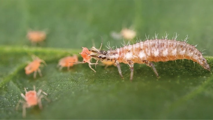 Turner started using biocontrols about two and a half years ago at Sarah & Michael’s Farm, a year-round cut flower farm that primarily produces lilies — because he had difficulty spraying aphids through the tall, thick canopies. He started with “the most universally recommended aphid predator,” the lacewing larvae (Chrysopa).