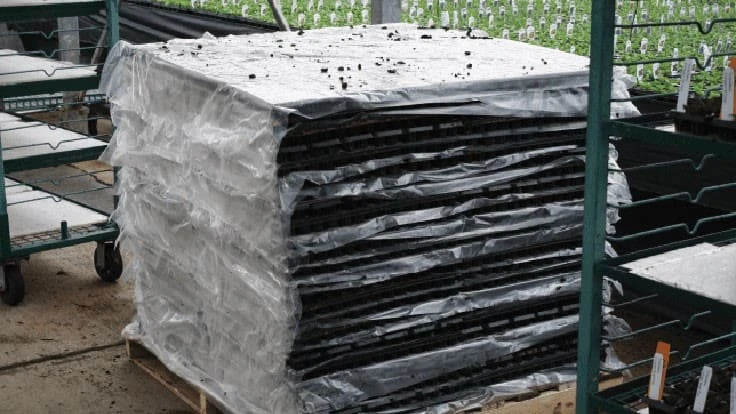 Alternatively, place plastic on top of the substrate between layers of trays or containers. This will help reduce moisture loss from the substrate and minimize shrinkage prior to potting.