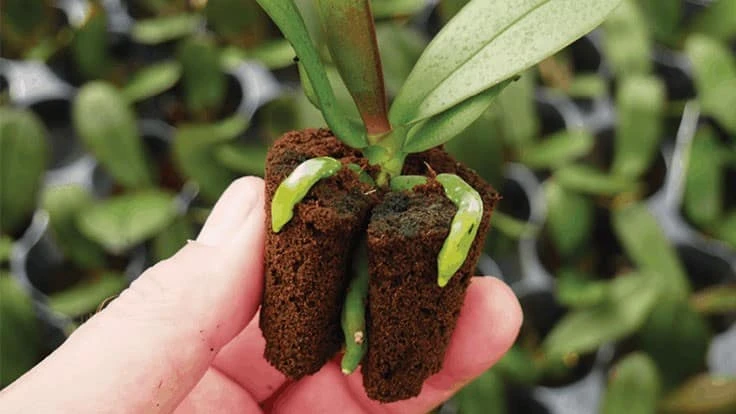 Molded-open plugs are the result of a need by the orchid industry in which large, delicate TC roots had to be transplanted rapidly. These plugs are shaped like the old video game “PacMan”, permitting the precise, vertically oriented placement of stage 3 roots with minimal stress and damage. Such plugs are finding broader application across the tissue-culture industry for species or cultivars that have long or brittle roots, or do not perform well when planted in loose fill or pre-dibbled holes.