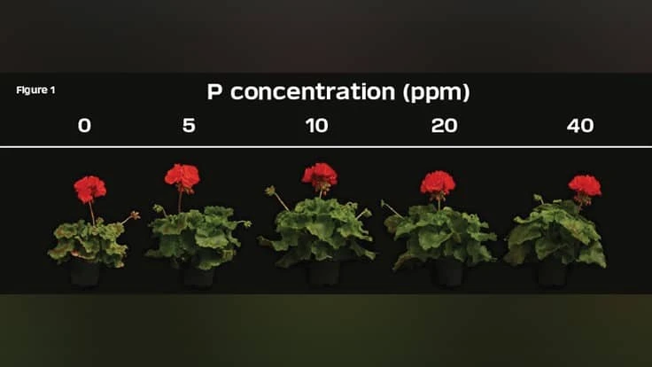 By providing less P to plants, there is less stretch and stem elongation (Fig. 1); however, P concentrations must be enough to avoid unwanted symptoms of P deficiency, which may reduce marketability. For example, P concentrations between 5 and 10 ppm P can control growth and produce healthy-looking plants with no P deficiency symptoms for a number of annual bedding plants and flowering potted plants.