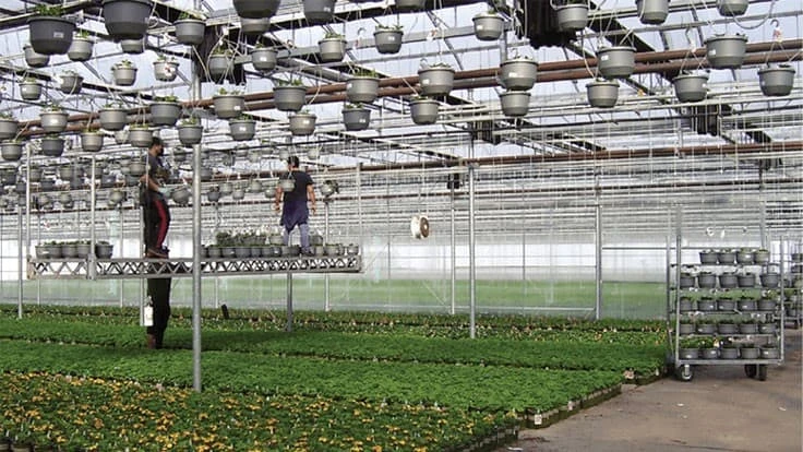 Mechanized placement and removal of hanging baskets can be done with overhead conveyor systems. These reduce labor, as walking is eliminated and watering is automated. Maintenance of plants can also be done at one location, usually an end cross aisle.