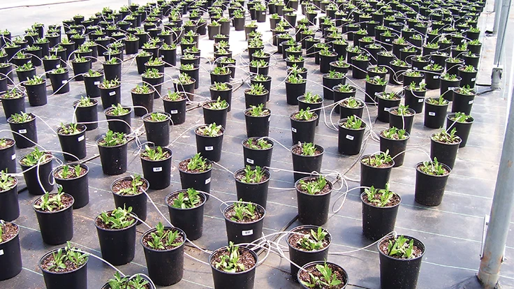 Select the best system for the crop. Overhead sprinkler systems work well on crops that are grown on the floor such as annuals and perennials in flats. They waste a lot of water when used on container crops as up to 75% of the water never gets to the root zone. For these crops, drip, trickle flood and trough systems are a better choice. These save 50% or water and require smaller piping and lower pump pressure.