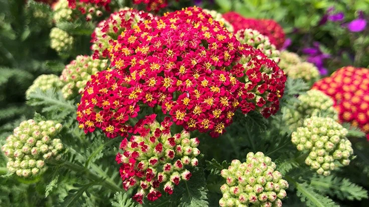 Achillea PENHOW Heartthrob has outstanding heat and drought tolerance. Attractive blue-green, fern-like foliage. Compact, well-branched habit. Adorned with long-lasting, bright-red blooms. Great for attracting friendly pollinators. Bred for a long season of interest in containers and perennial gardens alike.