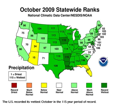 The October 2009 average temperature for the contiguous U.S. was the 3rd coolest on record for that month according to NOAA’s State of the Climate report. Temperatures were below normal in all regions with the exception of the Southeast, which had near normal temperatures for the month. The average October temperature of 50.8° F was 4°F below the 20th Century average. Oklahoma recorded its coldest October. Florida was the only state to record an above normal temperature average in October. It was the 6th consecutive month that Florida’s temperature was above normal.