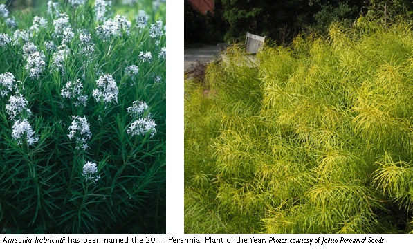 Perennial Plant Association named Amsonia hubrichtii (Arkansas amsonia, Arkansas blue star) as its 2011 Perennial Plant of the Year. Native to the Ouachita Mountains in central Arkansas, this bushy plant produces light blue star-shaped flowers and fine, feathery ¾-inch long foliage. It blooms during April and May. The flower color lightens in warmer temperatures.