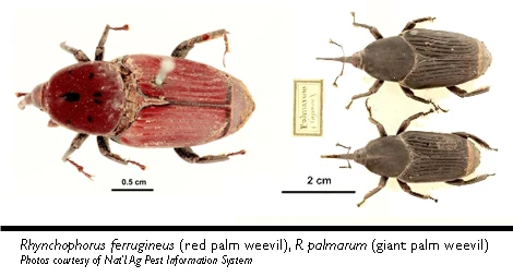 R. ferrugineus has rapidly spread throughout palm-growing regions of the Persian Gulf and Europe, and R. palmarum, along with its parasite, Bursaphelenchus cocophilus are widely distributed in tropical regions of Central and South America. These harmful palm pests have quickly spread to multiple countries through the nursery trade and have the potential to be a serious economic pest in palm-growing areas of the United Sates.
