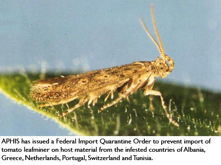 USDA-APHIS has issued a Federal Import Quarantine Order scheduled to take effect Feb. 1, 2010, for host material of tomato leafminer, Tuta absoluta (Meyrick), to prevent the entry or introduction of this pest into the U.S. from the infested countries of Albania, Greece, Netherlands, Portugal, Switzerland and Tunisia. APHIS issued Federal Orders in February and May 2009 that placed additional restrictions on currently admissible tomato fruit from the infested countries of Algeria, France, Italy, Morocco and Spain to prevent the introduction or dissemination of this pest in the U.S. Of these countries, only Greece, Netherlands and Portugal are currently authorized to export tomatoes to the U.S. APHIS has determined that it is necessary to prohibit the entry of plants for planting of Solanum sp., Datura spp. and Nicotiana spp., which are also hosts of T. absoluta, from all of the above mentioned countries pending the completion of a Pest Risk Analysis and the implementation of appropriate mitigation measures.