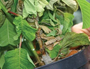 Rane said growers should scout for dead areas on the bracts and leaves which can signal Botrytis infection. Stems that appear to be suddenly wilted should be examined for tan or brown stem cankers caused by the fungus. The gray-brown, fuzzy growth of the pathogen may be seen on infected tissue when examined with a hand lens.