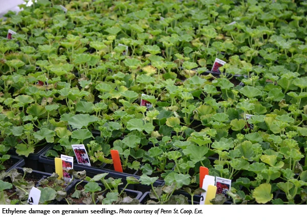 The effects of ethylene on crops vary with the plant species and growth stage, temperature, length of exposure, and the gas concentration. Tom Dudek, Mich. St. Univ. Ext. senior district ext. horticulture and marketing educator, said he has seen injury symptoms more often in plastic greenhouses compared to glass greenhouses, due to the airtight nature of poly-covered houses.