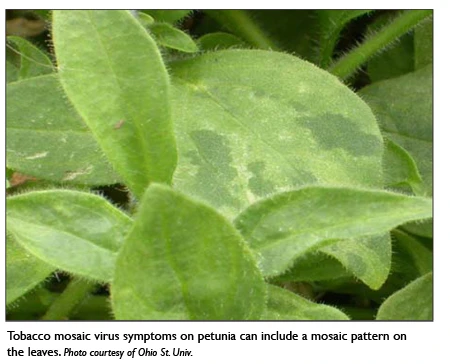 Growers are being reminded to inspect incoming cuttings for symptoms of tobacco mosaic virus on calibrachoa and other members of the vegetatively propagated petunia family. Mich. St. Univ. senior extension horticulture and marketing educator Tom Dudek tells growers to look for mosaic/mottle patterns and stunting. Leaf deformation can also be noted early on.