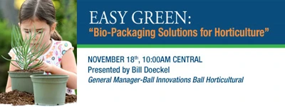 Bill Doeckel, general manager of Ball Innovations at Ball Horticultural Co., will present a free, one hour live webinar Nov. 18, at 10 a.m. Central time. Doeckel will discuss bio-packaging solutions for horticulture, presenting the various bio-options available. Items include solutions possible with bio-packaging, products currently available, how to position the products for a competitive edge, key metric to consider and trends to watch.