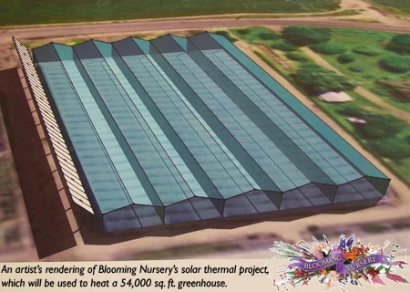 Grace Dinsdale, founder and president of 130-acre Blooming Nursery in Cornelius, Ore., is installing the state’s largest solar thermal project, reports The Oregonian. The project is not for generating electricity. The solar panels being installed will be used to heat 300,000 gallons of water in a concrete storage tank. The water will be circulated through underground heating pipes in a 54,000-square-foot greenhouse. The well-insulated water tank will retain heat for months. Dinsdale will continue to use natural gas to heat two other larger greenhouses and the fuel will serve as a backup for the solar heated house. Her heating bill has been around $150,000 annually. Dinsdale said she would not have installed the solar project if she had not received a 50 percent tax write-off under the state’s Business Energy Tax Credit program. She expects payback will take five to eight years. Another benefit of the project will be the flexibility it offers Dinsdale in regards to crops that she can produce. She told the paper one possible new crop could be tropicals.