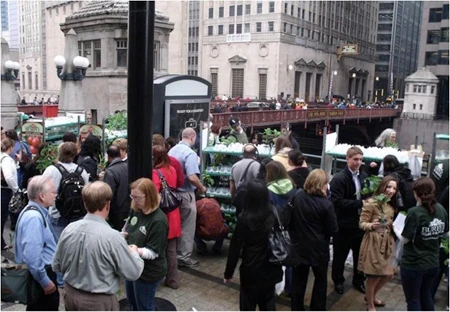 Pictured: On May 21 the Burpee Home Gardens Team distributed nearly 2,000 vegetable plants to downtown Chicago commuters and encouraged them to garden.