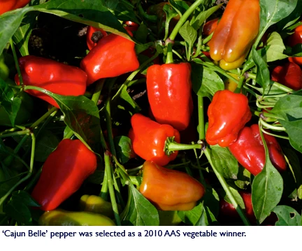 Capsicum annuuam ‘Cajun Belle’ has been named a 2010 All-America Selections vegetable winner. This bell pepper produces small 2- by 3-inch sweet and savory fruit that weigh about 1 oz.. The 3- or 4-lobed fruit starts bright green, turns scarlet and then deep red. Mature green peppers are ready 60 days after transplanting.