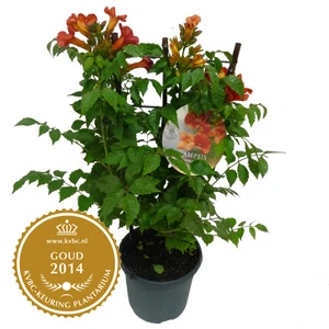 Campsis 'Takarazuka Fresa' (Summer Jazz Fire) has been selected as the best new plant at Plantarium 2014, an annual event in Boskoop, Netherlands. The plant was submitted by Hoogeveen Plants b.v. from Hazerswoude. According to the jury, the Summer Jazz Fire is a striking, compact plant which already flowers at a height of around 60 cm, which is unique within the Campsis range. The jury also praised the warm, orange-red flower colour and the healthy, dark-green leaves.