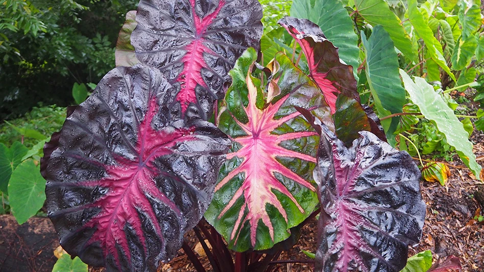 Redemption Colocasia features black leaves with pink centers. Rippled, shiny leaves mature from green to black with the pink blotch growing as the leaves mature.