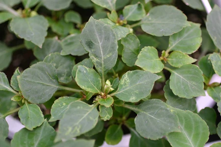Pictured: Now that warm temperatures have arrived growers should be scouting and monitoring for thrips (damage on impatiens shown) and spider mites, particularly on susceptible crops.