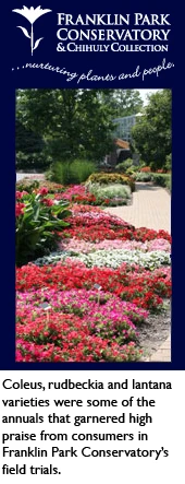 Several new coleus varieties (Trusty Rusty, Redhead, Henna and Mint Mocha) scored excellent ratings for vegetative quality, flowering performance and overall presentation at the Franklin Park Conservatory’s 2009 field trials in Columbus, Ohio. Visitors also indicated their preference for coleus by making Redhead, Henna and Mint Mocha consumer choice award winners. When asked to choose 3 trial entries that they would purchase, consumers routinely chose these coleus varieties. Also, making the consumer’s choice list were Lantana Lucky Pure Gold and Rudbeckia TigerEye.