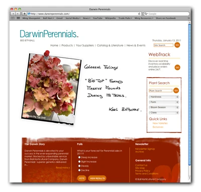 Darwin Perennials new website makes it easy for growers to find the plants they’re looking for in the forms that fit their business. A new plant search sorts the company's perennial varieties by hardiness zone, product form, bloom season and class. The site provides a product listing of Darwin exclusives and new introductions. A map shows the company’s rooting station network and available product forms across North America. Visitors can browse through the 2011 catalog to see brochures, culture sheets and the latest trade advertisements.