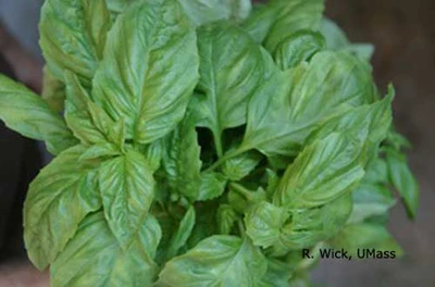Pictured: The discolored foliage on the upper leaf surface of a basil plant caused by downy mildew could be confused with a nutritional deficiency.
