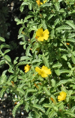 Turnera diffusa ‘Luisa’ is a multi-stemmed, densely branched evergreen shrub that grows to about 2½-feet tall. Its small grayish-green leaves are aromatic when crushed. It produces a profusion of ½-inch yellow flowers that are borne in the axils of the more terminal leaves. Although the flowers last only a day, they are quickly replaced by new flowers the next day.