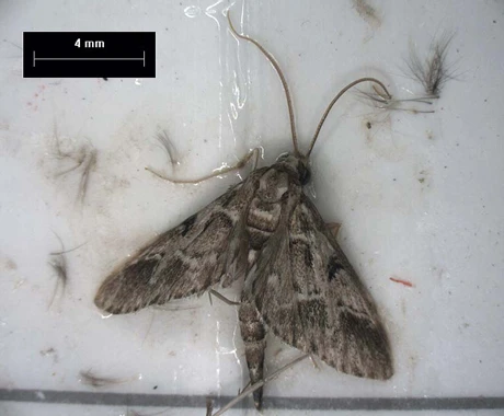 Pictured: Adult male Duponchelia fovealis in pheromone trap in San Diego County.
