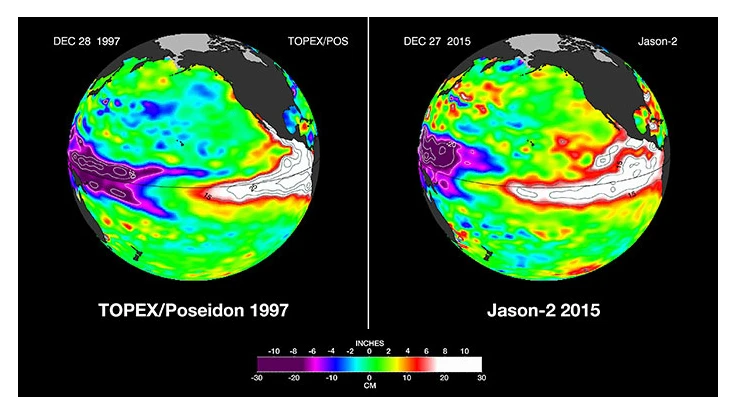The latest Jason-2 image bears a striking resemblance to one from December 1997, by Jason-2's predecessor, the NASA/Centre National d'Etudes Spatiales (CNES) Topex/Poseidon mission, during the last large El Niño event. Both reflect the classic pattern of a fully developed El Niño.