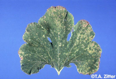Pictured: Small necrotic or chlorotic flecks appear on the upper leaf surface of downy mildew-infected cucurbit leaves.