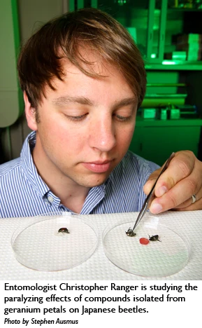 USDA-Agricultural Research Service scientists are working on a natural, botanical formulation for beetle control based on the paralyzing compounds isolated from geraniums. Scientists are also studying the differences in the leaf surfaces of geraniums to determine ways to help leaves retain pesticides that are applied to them, which could help to reduce pesticide use.