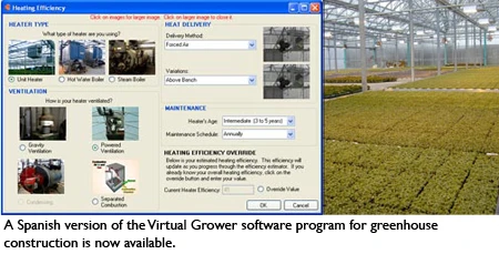 Virtual Grower 2.5, a software program that is a decision support tool for greenhouse growers, is now available in Spanish. The program allows users to build a greenhouse with a variety of materials, heating setups, fuel types, supplemental lighting and energy curtains. It enables the user to schedule temperature set points throughout the year and predict heating costs for over 230 sites within the U.S. Different heating and scheduling scenarios can be predicted with a few inputs. It can estimate fuel costs and plant growth for a production season.