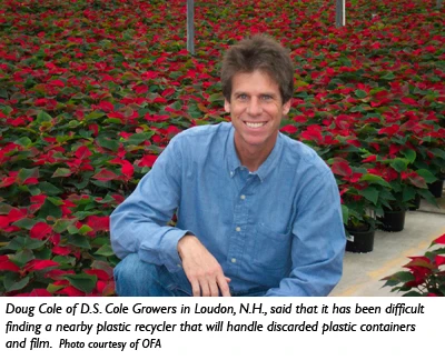 Greenhouse grower Doug Cole of D.S. Cole Growers in Loudon, N.H., told New Hampshire Public Radio that he uses about a half million plastic containers a year. He said it has been difficult finding someone in his area of the country that wants to recycle and use the discarded pots. He said the only people he is aware of who are interested in recycling the plastic are located in the Midwest. Cole, who operates 9 acres of greenhouses along with a retail garden center, said he has found a local company that was willing to pick up and recycle his containers. The catch, the company required a full truckload. Cole said most garden centers, regardless of size, discard of used containers in landfills.