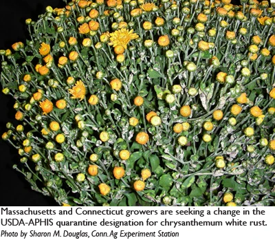 The Mass. Flower Growers Assoc. and Conn. Florists Assoc. have sent letters to Rebecca Bech, deputy administrator of USDA-Animal and Plant Health Inspection Service’s Plant Protection and Quarantine program, asking the agency to consider changing the designation of chrysanthemum white rust (Puccinia horiana Henn.) as a quarantine pest. The letters indicate that the disease has been a major concern the last few years for growers of fall mum crops. They state that existing regulations and implementation of the quarantine eradication protocol have caused member growers and retailers financial hardship. The quarantine status has also hindered interest in research by university scientists and chemical manufacturers.