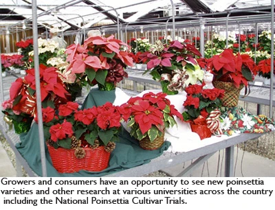 Purdue, N.C. St. Univ. and Univ. of Fla. participate in Nat’l Poinsettia Cultivar Trials. Several other universities and commercial growers, including Univ. of N.H. and Ohio St. Univ., also conduct poinsettia trials and open houses that look at new varieties and other aspects of research.
