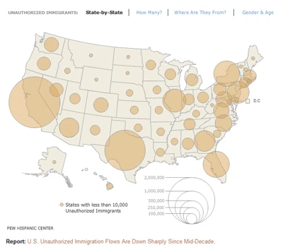 According to new estimates by the Pew Hispanic Center, the annual influx of unauthorized immigrants into the U.S. fell nearly two-thirds from March 2007 to March 2009 compared to between March 2000 and March 2005. The decline resulted in an 8% reduction in the number of unauthorized immigrants living in the U.S. The decrease from a high of 12 million in March 2007 to 11.1 million in March 2009 represents the first significant reversal in growth of this population over the last 20 years.