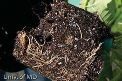 Univ. of Md. extension personnel advise poinsettia growers to look for foliar chlorosis on plants. They should then inspect the roots to see if there is any discoloration that could indicate root diseases problems such as Pythium. Roots infected with Pythium turn brown and the root sloughs off at the tip leaving a fine strand. To avoid root rot problems be sure to allow the growing medium to dry out between watering. Fungicide options include FenStop, Banol, Banrot, Truban or Terrazole and Subdue Maxx. Rotate products with different active ingredients to avoid resistance in Pythium populations. Some Pythium strains may be insensitive to Subdue Maxx.